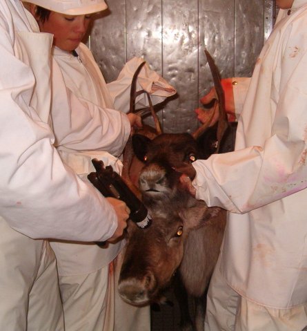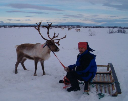 | Slakteopplæring ved det samiske opplæringssenteret i Inari. Her lærer Jon Inge Eira avliving med slaktepistol. (Foto: SVSRS) | Da dette intervjuet blei tatt, hadde ennå ikke elevene fra reindriftsskolen vært i Russland, men det skjedde året etter. Her er elever og lærere i Lujavri 2005/06. Fra venstre: Ole Johnny Eriksen, Kristian Solbakken, Nils Ailu Kemi, Per Inge Andersen, Klemet I. Hætta, Per Inge Johansen, Ante Mihkkal Gaup.