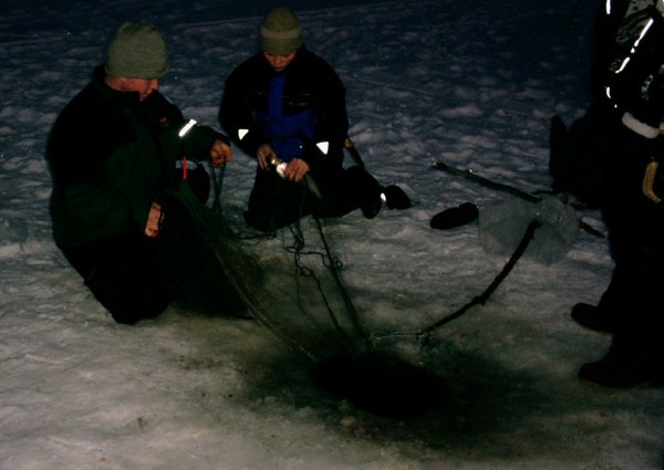 Det er ikke bare reindrift man lærer på reindriftsskolen, men også tradisjonell allsidig bruk av naturen. Her er elevene Ante Johan Oskal og Risten Marie Buljo i ferd med å fiske med garn under isen (juoŋasteapmi). (Foto: SVSRS) |