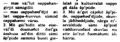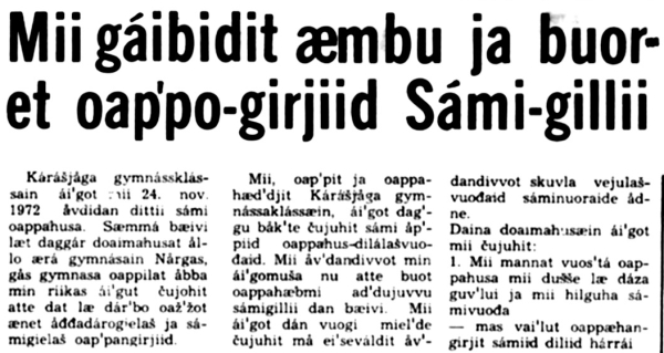 | 1970-logus ledje stuora rievdadusat Norgga joatkkaoahpahusas. Stuoramus rievdadus bođii joatkkaoahpahuslágain, mii mearriduvvui 1974:s ja biddjui fápmui 1976:s. Dáinna biddjojuvvojedje ovddes iešheanalaš skuvlašlájat, nugo gymnása, fidnoskuvla ja gávpeskuvla, oktii joatkkaskuvlan. Ovdal go láhka mearriduvvui gohččoduvvui dávjá "ođđa gymnásaláhkan". Dát cealkámuš leat mii gávdnan Girko- ja oahpahusdepartemeantta arkiivvas, Riikkaarkiivvas. Dat čájeha ahte Kárášjoga gymnása oahpit lea searvan riikaviidosaš akšuvdnii, maid jáhkkimis Norgga Gymnasiastasearvi (Norges Gymnasiastsamband - NGS) lea álggahan, ja seammás sii leat ákkastallan sámi oahpahusaid beroštumiiguin. Mii bájuhit dan juste nu go lea čállon. Oahppit ledje ieža čállán dokumeantta sihke sámegillii ja dárogillii ja dat speadjelastá dalá čállinvuogi, sátneválljema ja čálalaš sámegielmáhtu. |